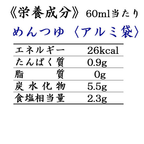 めんつゆ:ぶどう糖果糖液糖(国内製造)しょうゆ、食塩、砂糖、みりん、かつおエキス、まぐろエキス、醸造酢、さばエキス、ふし(かつおぶし、むろあじぶし、さばぶし、いわしぶし)、